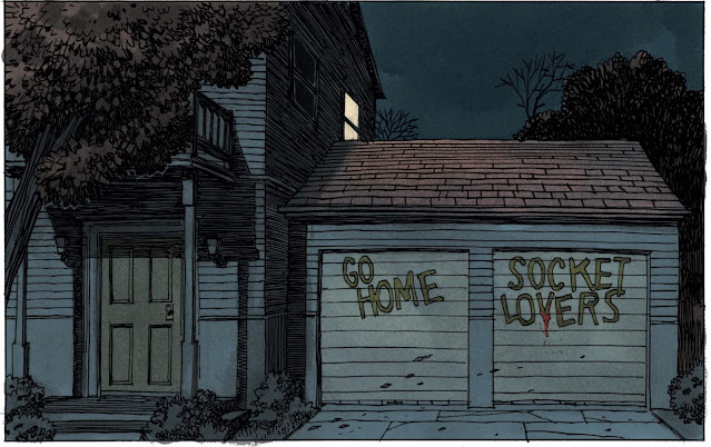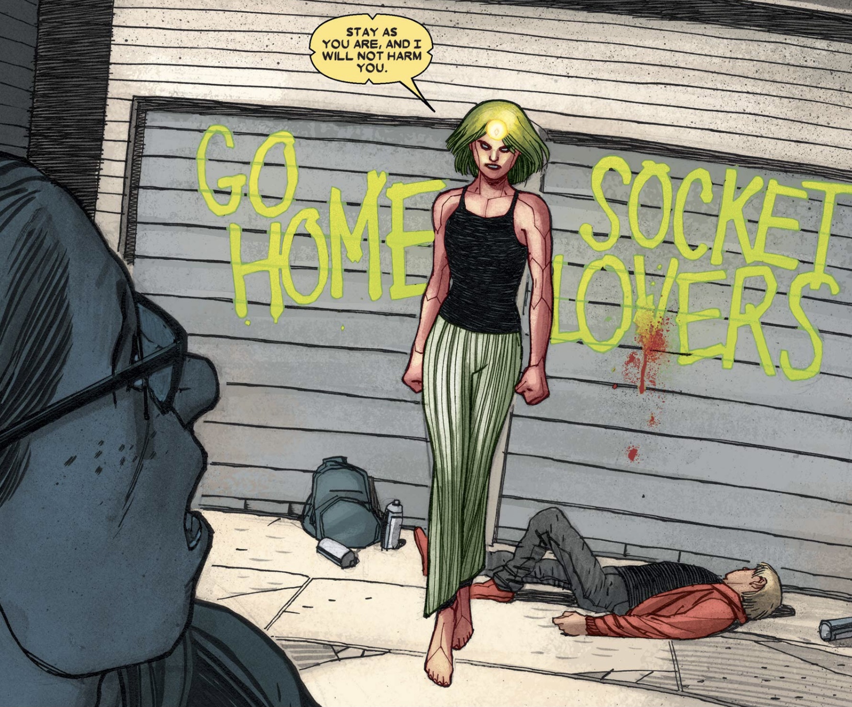 Now we open with some punk kids spray-painting some slurs on the Visions' garage door. Virginia quickly, if violently, dispatches them. Amusingly, writer Tom King abruptly cuts the scene off, so we don't really know what is the fate of the kids.