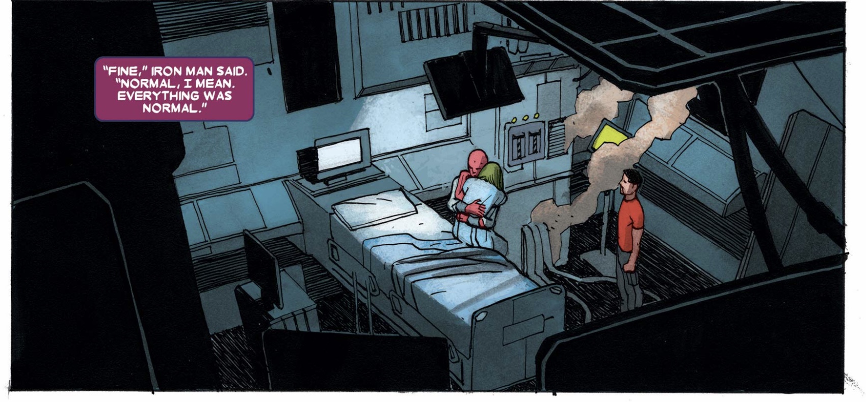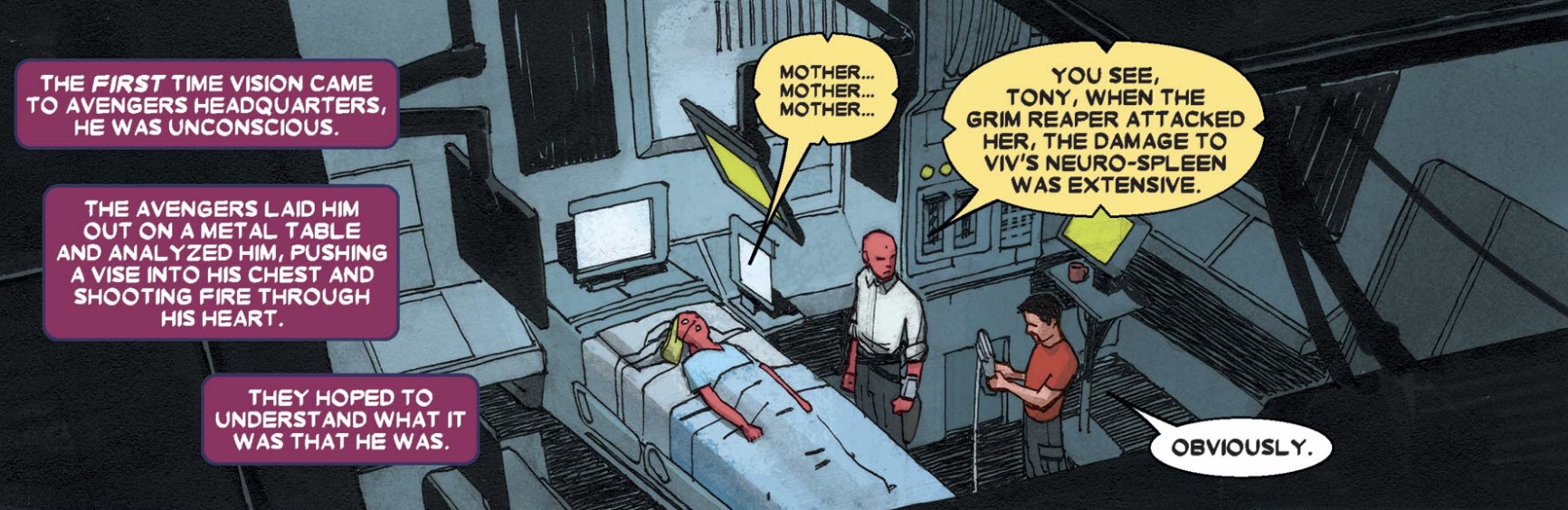 Elsewhere, we see Vision with Tony Stark trying to revive his malfunctioning daughter Viv. There is a hidden character joke where Vision subtly mimics human behavior that he's observed from his Avengers cohorts.