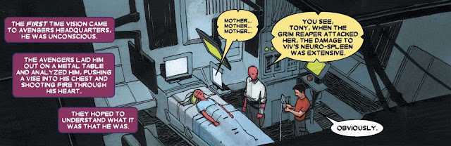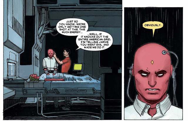 This is another example of sampling, where Vision took a phrase or a word and recontextualizes it in a different conversation. Here, Vision takes the word "Obviously" and twists the meaning. It is something that is both a very human and a very robot thing to do. This duality of Vision's robotic nature and human behaviors have been at the center of the character's struggle since his inception. King summed it all up in one exchange.
