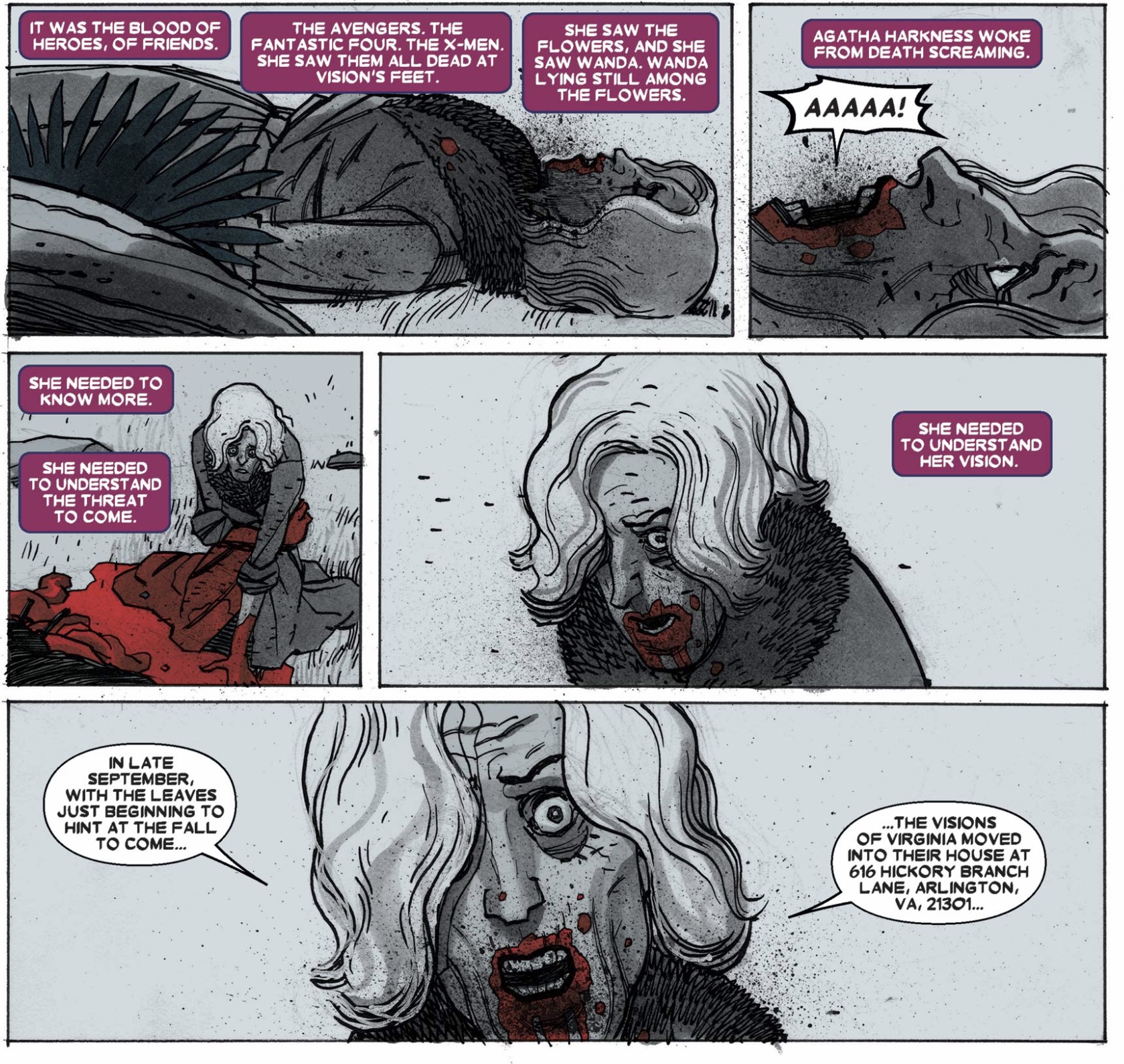 So what follows is the most grotesque sequence in the series. Agatha kills Ebony and eats his stomach. She then convulses on the ground and has a vision of the Avengers, X-Men, and Fantastic Four dead at Vision's feet. Then- as if she is possessed-Agatha starts reciting the opening lines of the series.