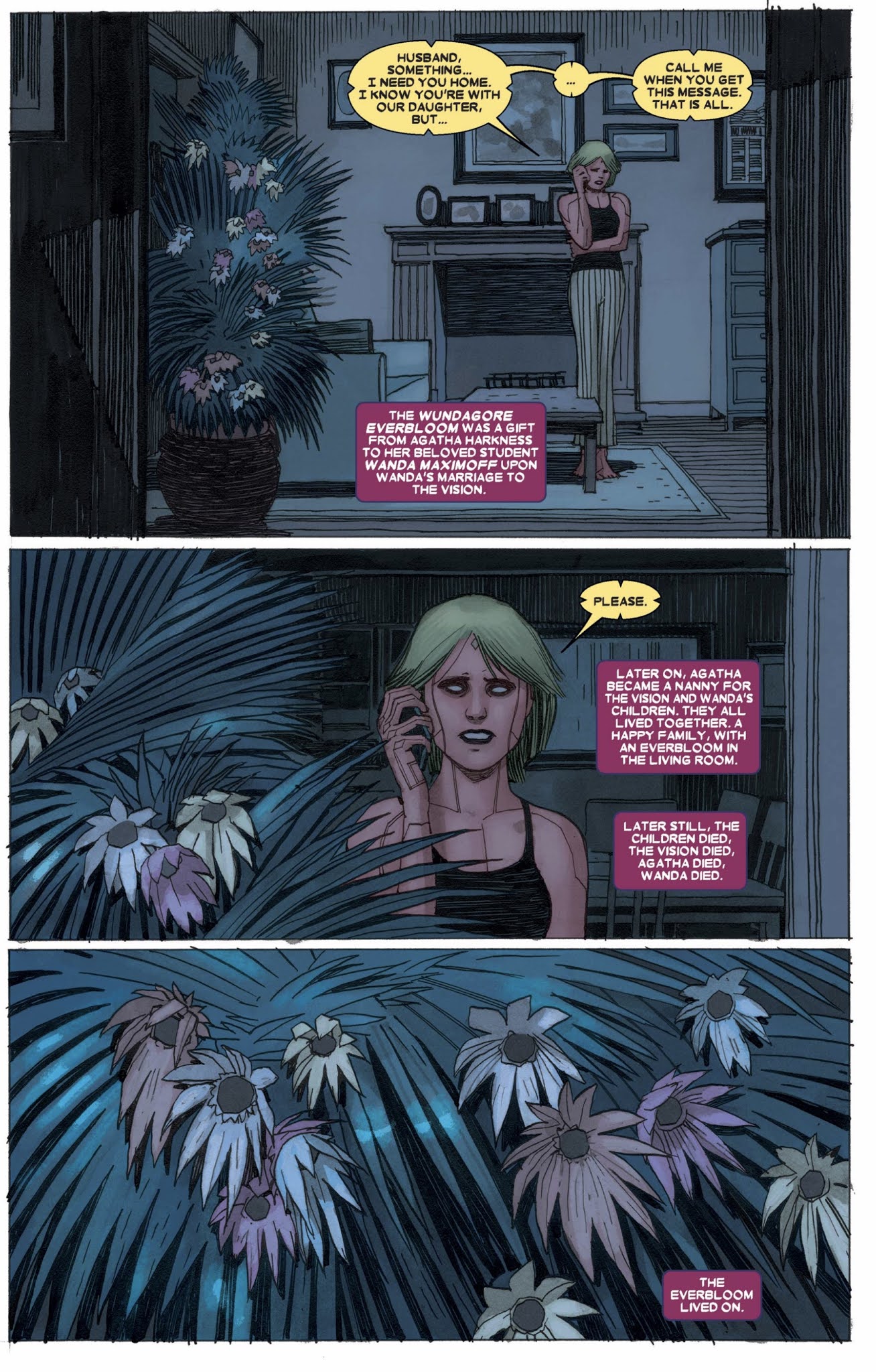 We finally see a flashback sequence of the Everbloom plant with Agatha Harkness of "Agatha All Along" fame. However in comics canon, Agatha is Wanda's den mother and mentor of her magical powers.