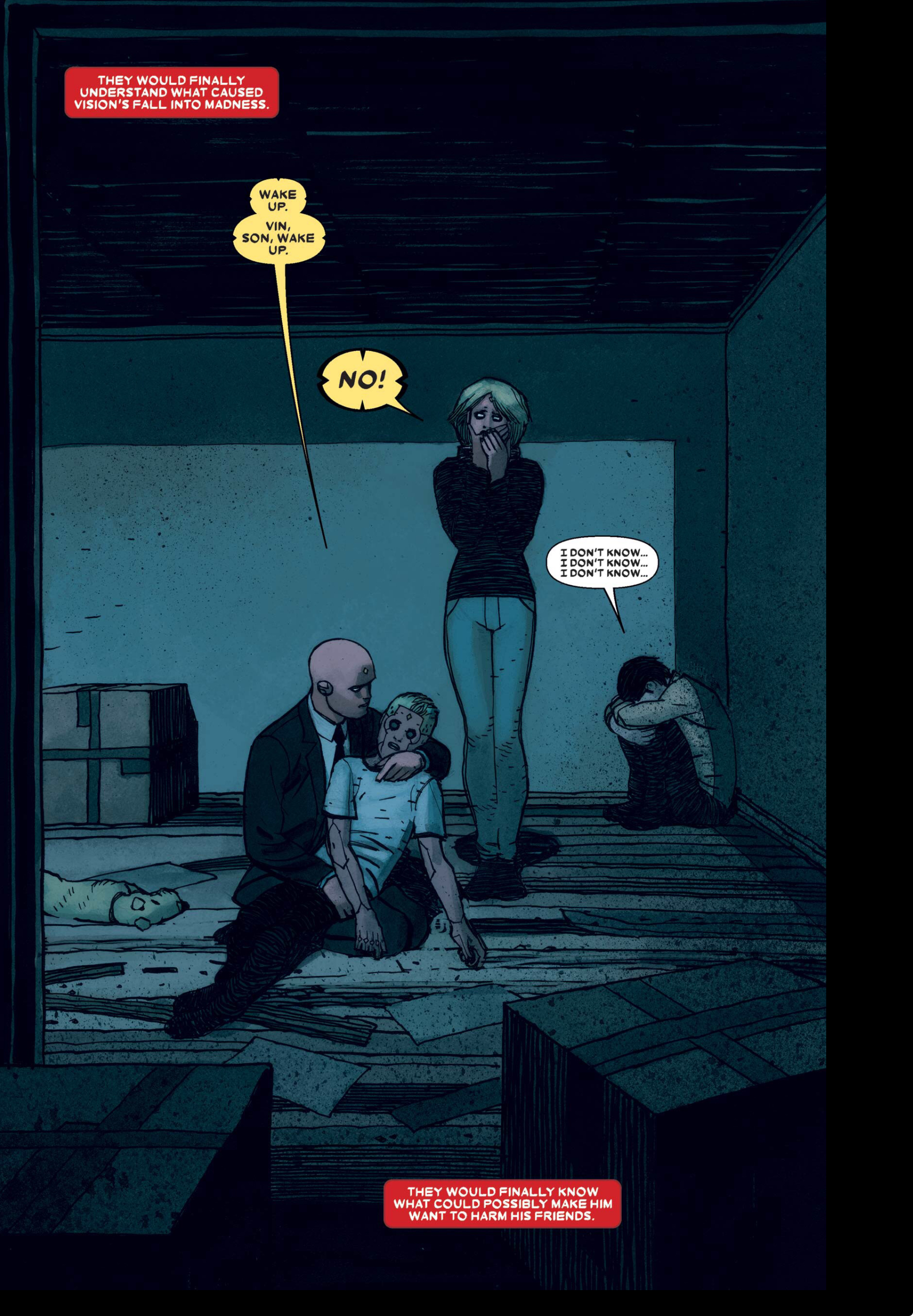 Vision and Virginia both find Vin's now-inert body on the floor. Victor is in the corner of the room crying, "I don't know... I don't know... I don't know..."