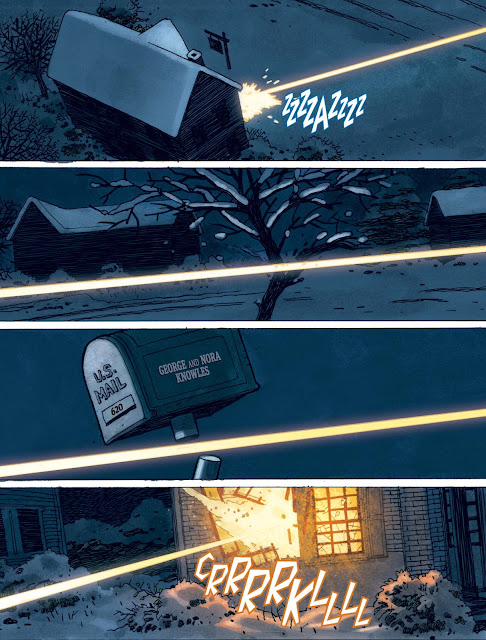 In a panic, Victor shoots Vin with his electro-magnetic powers. However, Vin also tries to fight back with his forehead beam. Unfortunately, Vin is writhing in pain, which causes him to misfire and shoot the Knowles house- setting it ablaze. Thus it fulfills the Agatha's prediction from way back in issue one that the Visions' neighbors George and Nora Knowles will die in a fire.